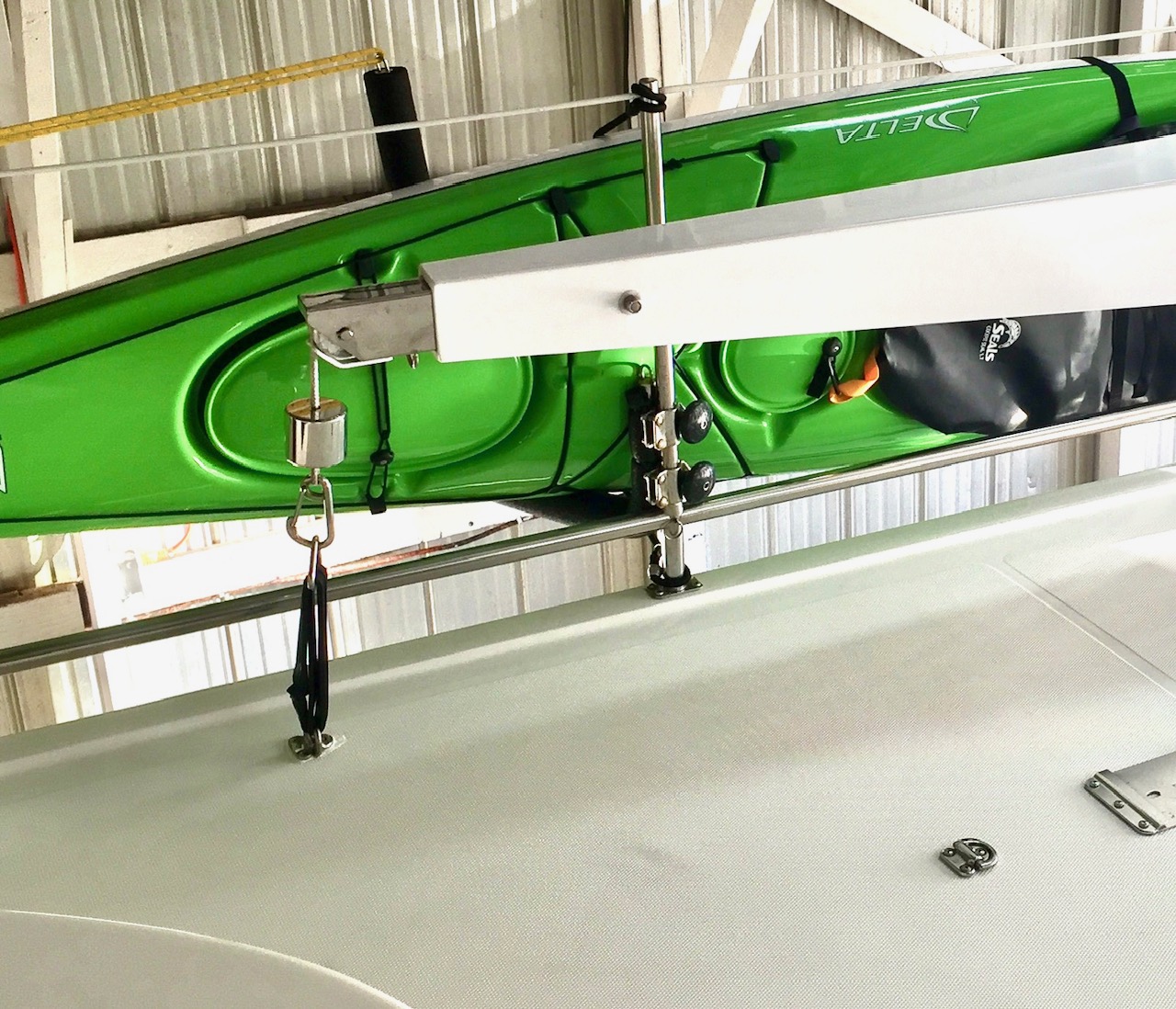 So, we love storing our Walker Bay 310 Consul Dinghy with 20HP Tohatsu up top. Using the Steelhead works very well for us. The chocks and tie downs make it extremely secure and we never have to worry about it no matter what the sea conditions are.