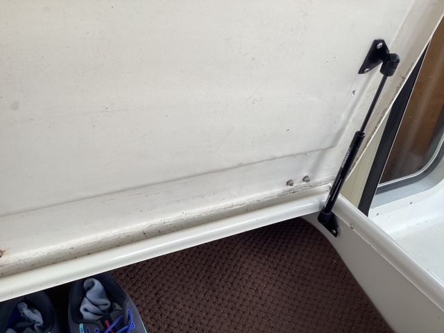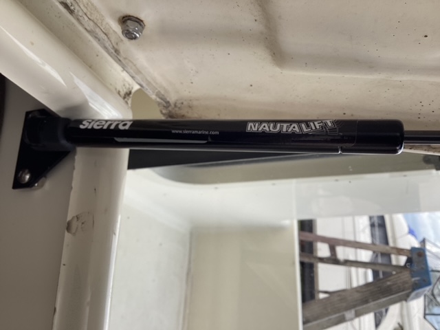 Here are the photos of the Sierra gas strut. It is rated at 20lbf. It will hold the lid up, but is not sufficiently strong to keep the lid from slamming shut. I will replace it with a stronger strut in a few days. Now back aboard and working through our maintenance list.